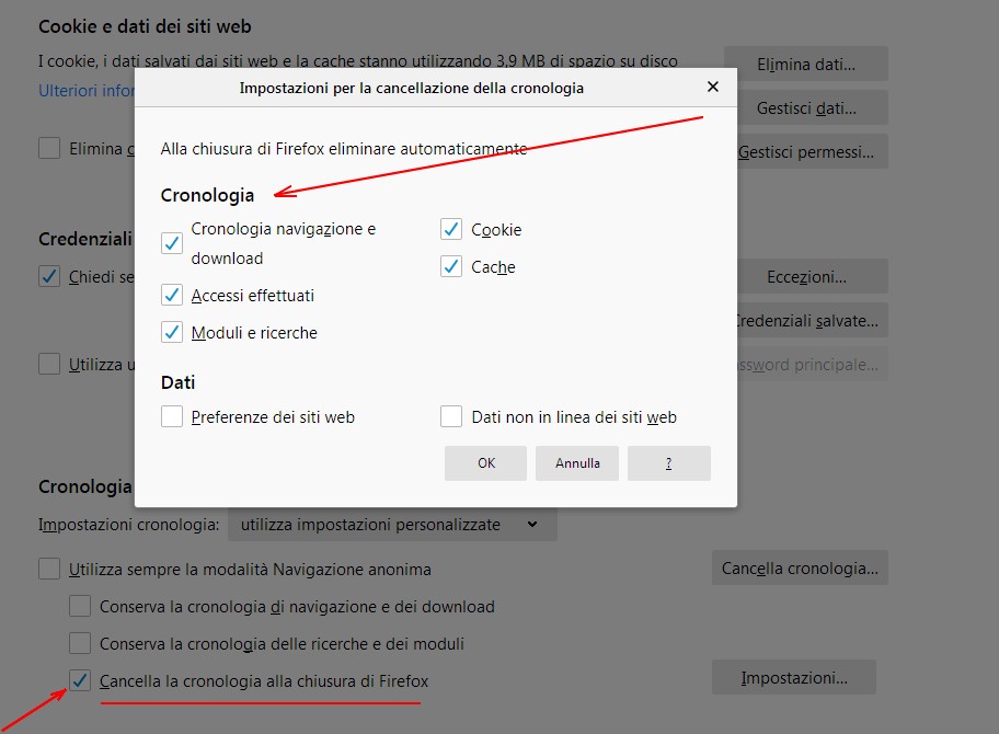 Su Firefox prova a configurare come da mio screenshot, questa configurazione ti servirà a ripulire tutto, se poi tutto funziona, se preferisci puoi anche modificare e spuntare solo "Conserva la cronologia di navigazione e dei download" e "Conserva la cronologia delle ricerche e dei moduli", eliminando la spunta su "Cancella la cronologia alla chiusura di Firefox", in questo modo anche se chiudi FireFox alla riapertura di Firefox quando andrai su amiganews ti ritroverai già connesso.