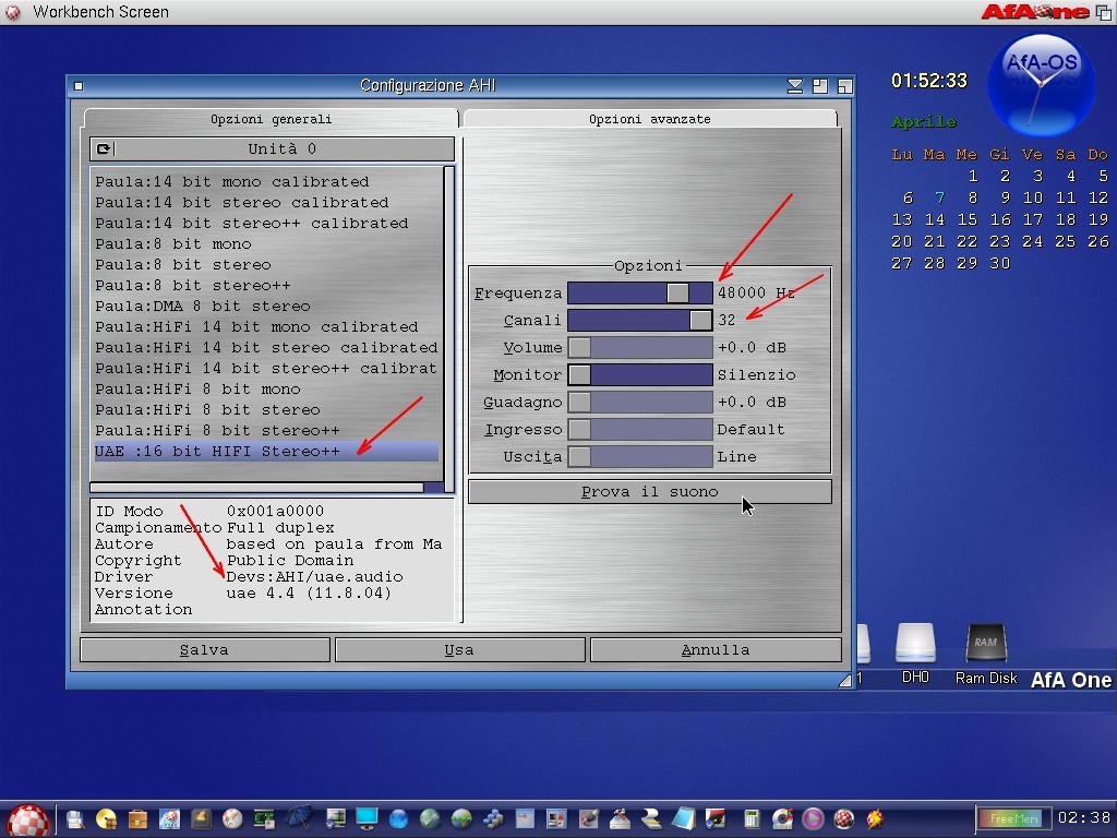 AMIGASYSTEM ha scritto:Come detto in privato su Amiga va bene paula 8bit fast stereo ++, su WinUAE invece è molto meglio settare UAE HiFi 16BIT, migliore qualità migliore potenza, uno dei tuoi errori poteva anche essere causato dalla mancanza del driver Audio UAE nel sistema, se questo fosse stato settato nelle prefs di AmiDuke o AmiQuake2.