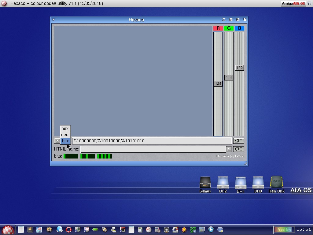 Piccolo strumento per la codifica e regolazione valori colori che consente di scegliere facilmente un colore e copiare il suo codice (hex/dec/bin); nel readme tutte le informazioni e l'uso dell'applicazione.