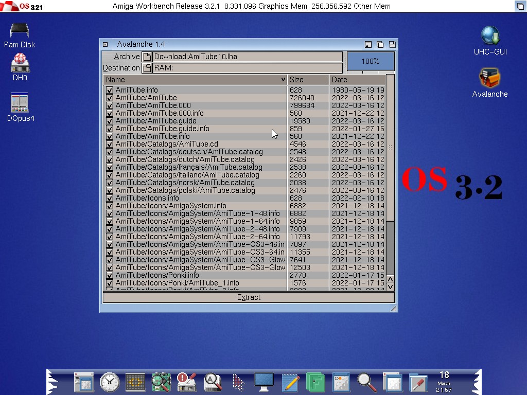 Avalanche: Comoda GUI per la XADMaster.library, libreria che consente di scompattare tutti i formati di compressione più comuni nativi Amiga come LHA e LZX o altre piattaforme come ZIP, 7zip, Bz2, GZ, TAR.GZ.