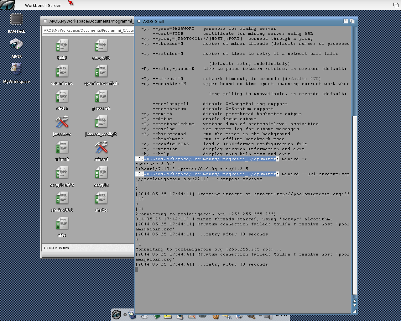 _ ultimo ma non per questo, da un mesotto ho iniziato il porting su AROS di cpuminer (il software che serve per "minare" tutti i tipi di criptomonete), devo soltanto risolvere un problema con le bsdsocket library. Dopo di che iniziero' a fare il porting del wallet, sempre su questo S.O.