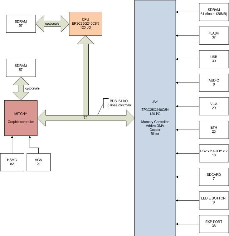 Trovi l'uscita VGA sia su JAY che su MITCHY perche' dovendo partire dal progetto minimig si pensava di creare una porta VGA 'temporanea' connessa a JAY che permetesse lo sviluppo (in pratica caricando minimig per DE2 su JAY dovrebbe funzionare subito). Poi con il tempo e con gli sviluppatori :felice: si spostera' la gestione della VGA su MITCHY perche' e' lo scopo per cui esiste e la VGA su JAY non verra' nemmeno montata nelle schede definitive.