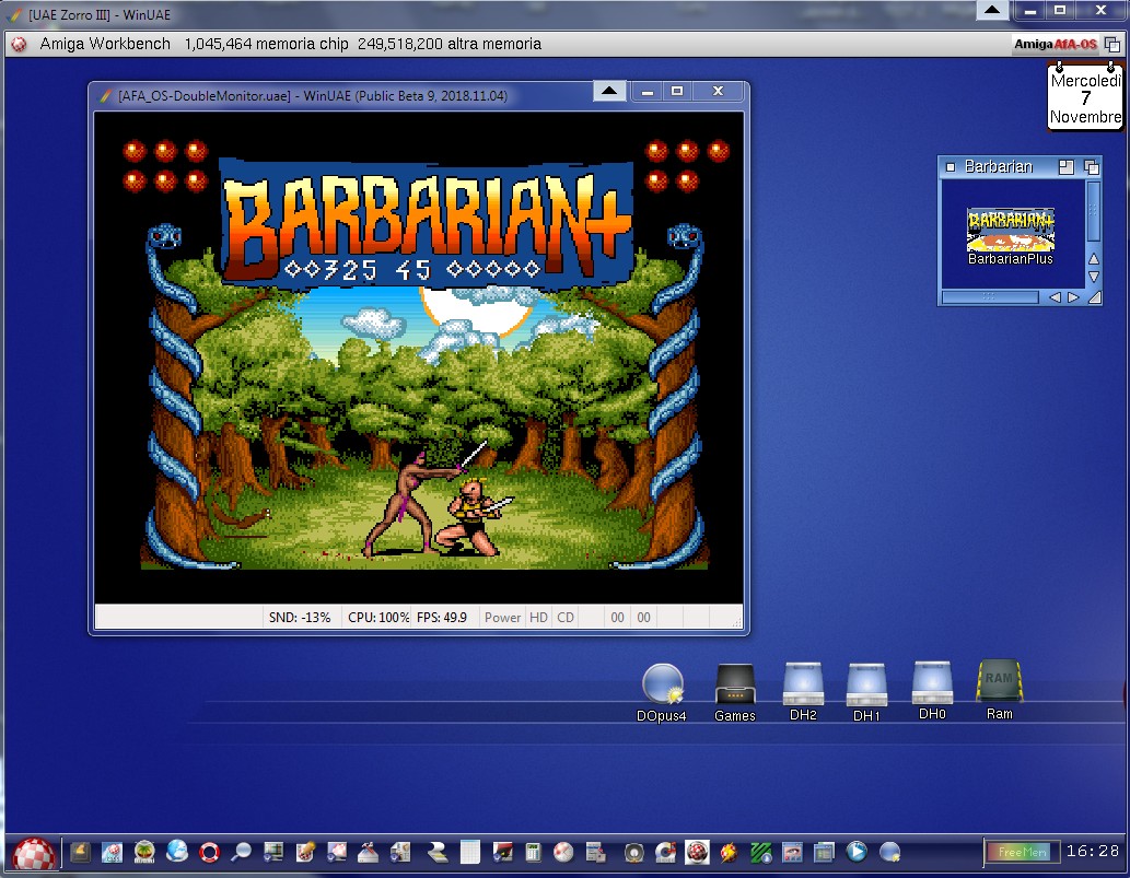 Per essere un gioco fatto in Amos non è male, funziona bene anche da Workbench con qualsiasi OS e su schermi ad alta risoluzione. Come potete vedere dallo screenshot ho eseguito BarbarianPlus su WinuUAE con doppio Monitor RTG + PAL, non si tratta di una esecuzione in finestra ma su due Montitor distinti, WinUAE ora supporta 4 Monitor Virtuali contemporaneamente.