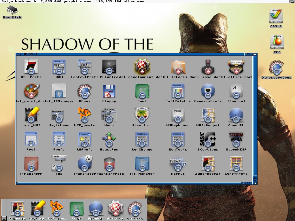 Ma guarda nello screenshot da te postato non c'è nulla di speciale, è solo un OS 3.9 RTG con la Icon.library di Peter installata, le icone invece sono del pacchetto OS4-Mason, sul bordo finestra dovrebbero essere i tab di MUI base. Creato al volo in 2 minuti lo stesso Workbench, non ho installato VisualPrefs e Birdie perchè non mi sono mai piaciuti, poi magari per migliorare le finestre e i caratteri ci aggiungo l'estensione AfA-OS e per chiudere un bel pointer rtg.