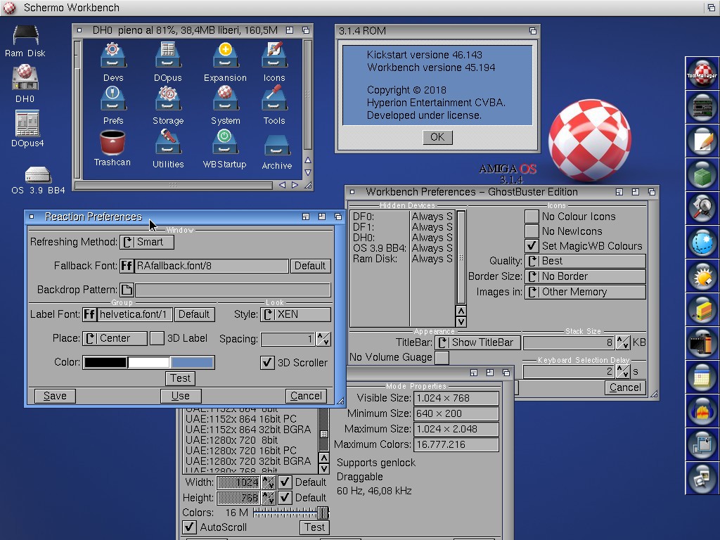Tornando su OS 3.1.4 sento parlare di difficoltà ad eseguire applicazioni "Reaction" native OS 3.9 su OS 3.1.4, cosa veramente semplicissima infatti basta solo copiare qualche libreria. Il problema di mischiare questi due OS è un'altro come già citato tante volte, mischiare un sistema più vecchio su uno più nuovo non è mai una buona scelta questo vale su qualsiasi OS, parlando di Windows per esempio non si può usare parti del sistema di WinXP su Win7 o Win10.