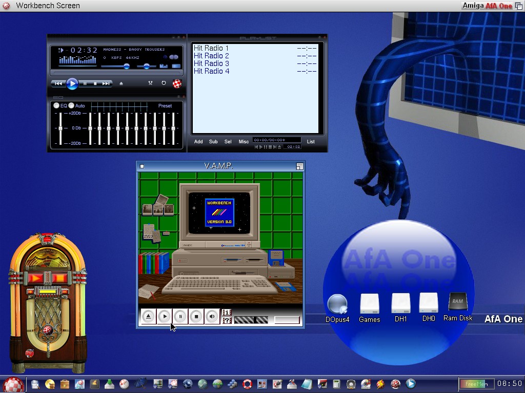 Inserite in StartMenu alcune voci mancanti, tradotto in italiano il Menu, inserito uno sfondo trasparente e impostato sulla barra il "Nascondi automaticamente" come accade per la Barra Strumenti di Windows. Anche per il Workbench è stato impostato il "Nascondi automaticamente" della Barra Superiore Titolo, per rivederla basta avvicinarsi con il Mouse.