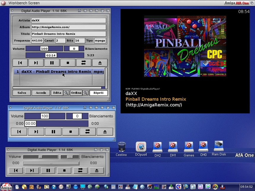 DAPlayer è un Lettore Audio Digitale per OS3, OS4 e MOS CHE riproduce MP3, AIFF, WAV, FLAC, OGG, CDDA RAW DATA, MIDI, DBM, MOD, S3M, XM, CD-AUDIO, streams MP3, OGG,ACCD e CD .