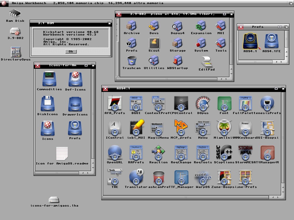Vorrei sfatare che AfA-OS richieda un OS 3.9 BB4 super accessoriato, ho fatto un piccolo esperimento ed ho istallato AfA_OS su WinUAE un OS3.9 BB2 CPU 68020/68881/JIT/16MB RAM, Scheda Grafica UAE Zorro III, e voilà il 3.9 si è modernizzato con skin finestra e icone ad alta qualità, senza il bisogno di installere la nuova icon.library di Peter (ma la si può anche usare). Naturalmente è sempre richiesta una FPU ed uno schermo RTG, non ho provato se funziona anche su un sistema 3.9 base, se dovesse interessare a qualcuno potrei provarci