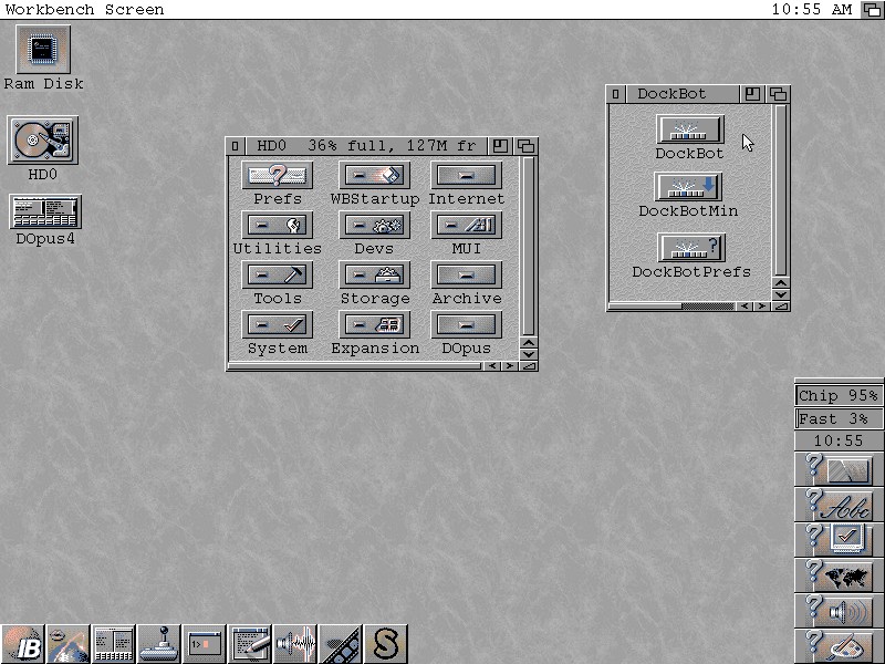 DockBot: Nuova e comoda Barra Applicazioni per eseguire programmi dal Workbench con un semplice Click, DockBot richiede la presenza della "IconLib 46.4" e supporta anche schermi RTG. DockBot è estensibile e può visualizzare più gadget come Orologio o strumento consumo Ram, inoltre include un programma di preferenze semplice e intuitivo per configurare i progammi da eseguire, l'applicazione inoltre supporta qualsiasi tipo di Icone incluse le Dual-PNG o le icone OS4.1 native.