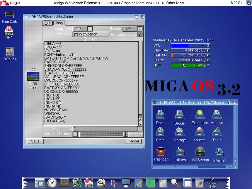 NewMeter: Nuova versione della graziosa e utile applicazione localizzata in italiano che mostra sul Workbench su un grafico a barre la quantità di RAM libera, CPU residua e lo spazio rimasto nei vari Volumi presenti sul sistema, inoltre mostra anche Ora e Data completa edel giorno.