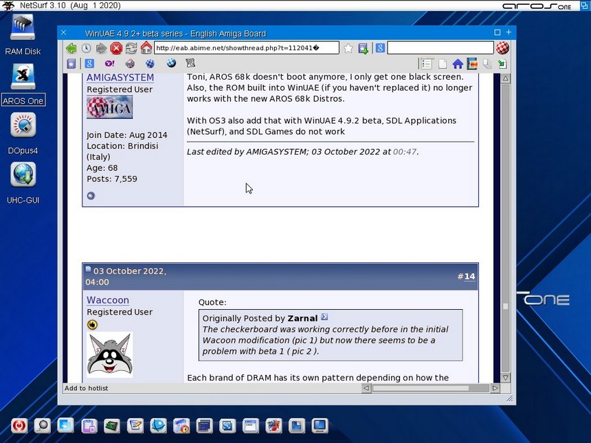 Nelle ultime beta posso confermare che l'emulazione OS4.1 e AROS 68x funzionano molto bene, direi meglio visto che adesso molte emulazioni sfruttano direttamente l'hardware del PC, quindi molta più velocità e qualità.