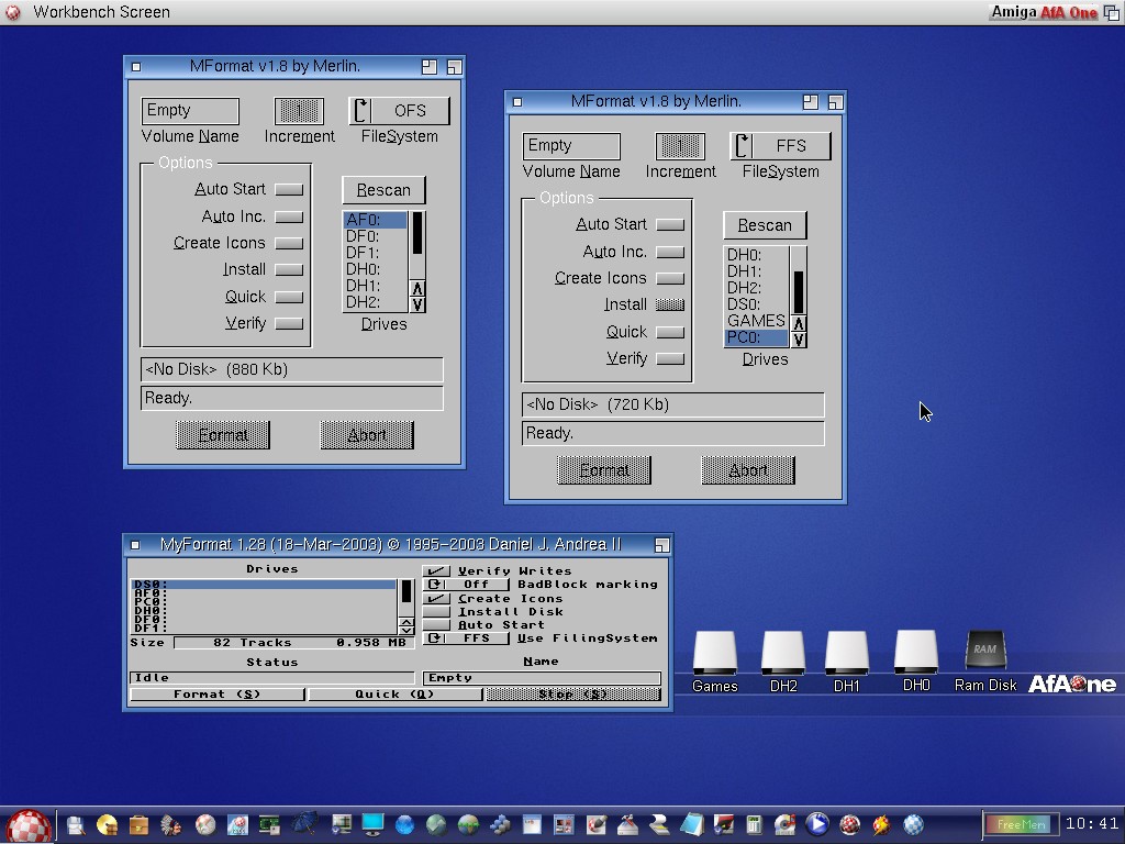 Inoltre sfruttando il Filesystem PFS i Lettori Floppy DD e HD aumentano la velocità di lettura e scrittura notevolmente, ma anche questi perdono l'avvio diretto (bootloader) e per vedere il contenuto del floppy DD/HD bisogna fare prima il montaggio attraverso una Mountlist (AF0).