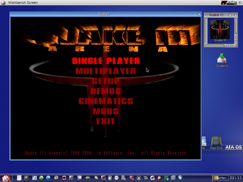 Ancora in fase di ultimazione ma il motore di Quake III gira già su OS3 68k e WOS, Testato con successo su AFA OS la versione 68K anche se ancora c'è un piccolo conflitto nel "full single", probelma che si risolverà non appena sarà compilata la nuova versione già pronta per WOS che troverete nella recensione che farò nei prossimi giorni. Allego uno screenshot di Quake 3 su AFA OS in finestra anche se l'autore consiglia al momento l'uso dello "Fullscreen" per una resa migliore, ad ogni modo il gioco per il poco che ho testato è veloce e non presenta alcun rallentamento. Piccola chicca per chi ama le Dual-PNG Icons, ho creato personalmentee e donato alla comunità le icone Cassetto ed eseguibile di Quak 3, allego il mio archivio icone: