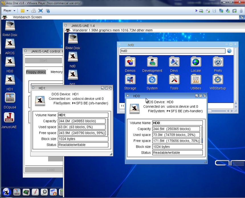 Il Tutorial prosegue con il montaggio della Pendrive su AROS One x86, fatto questo con l'emulatore JanusUAE incluso su AROS One ho avviato il Sistema Operativo installato sulla Pendrive, entrambe le partizioni sono state ben gestite JanusUAE, che risulta molto veloce e funzionale.