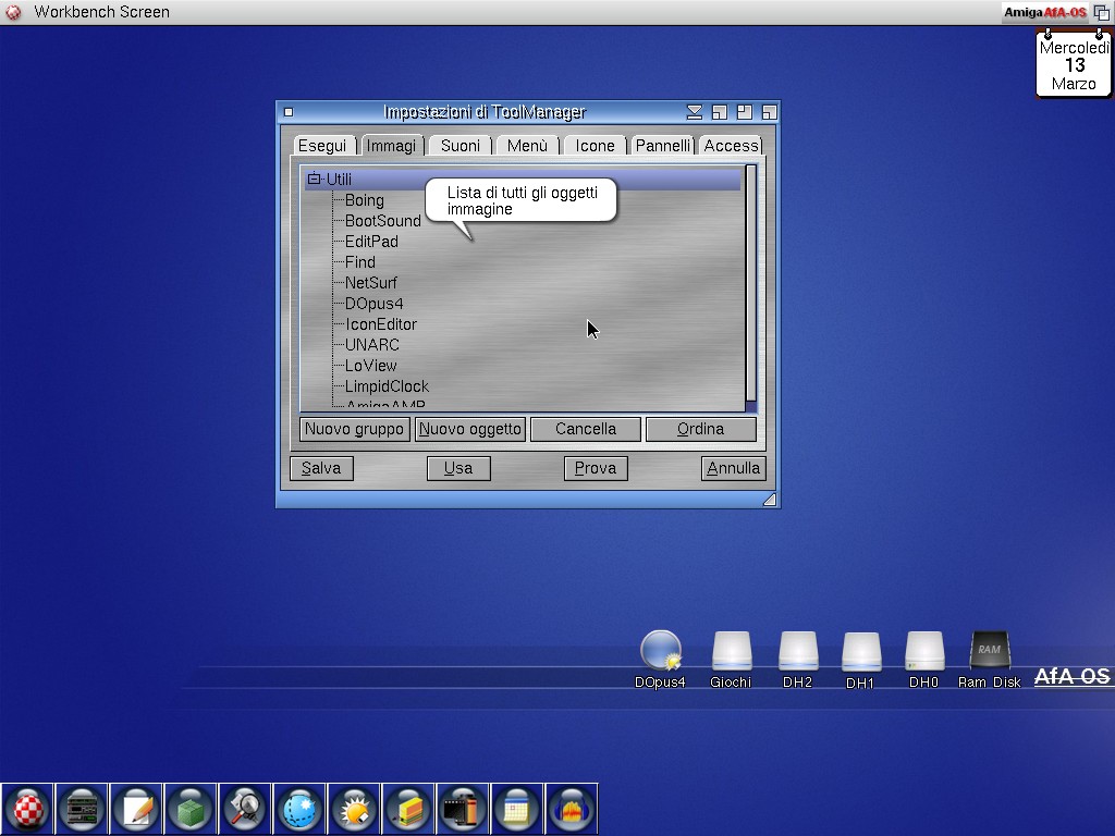 Parliamo ora di un software molto conosciuto ovvero ToolManager, un applicativo a me sempre stato ostico e antipatico e mai utilizzato sui miei vecchi OS. Ieri visto la richiesta di un utente che aveva avuto problemi a configurare questo Tools su un OS 3.1 RTG, mi sono deciso di testarlo. A primo acchitto il programma sembra essere complicato, ma dopo avermi studiato una configurazione già bella e confezionata su ApolloOS (almeno è servito a qualcosa), ho deciso di trasferire e migliorare questa configurazione su un mio OS 3.1 RTG. Terminata l'operazione visto la semplicità e l'espandibilità di questo Tools ho deciso di crearmi una nuova configurazione utilizzando pennelli di alta qualità prelevati qua e là tra le varie icone Dual-PNG trovate sul mio Sistema Operativo, allego due screenshot che mostrano ToolManager installato su OS 3.1 RTG e AfA-OS 3.9 BB4.