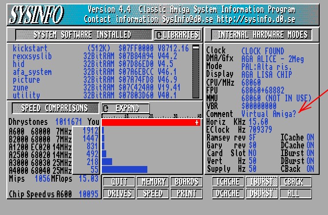 SYS info è una applicazione inutile per WinUAE lo vede come "Virtual Amiga?" vedi screenshot e riporta dati sballati.