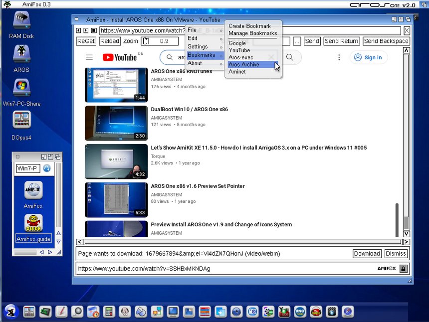 Installato e testato AmiFox su AROS One v2.0 di prossima pubblicazione, direi una bella proposta che consente di raggiungere quei siti dove OWB ha difficolta di gestire, siamo alla beta4, ma AmiFox comincia a prendere le sempianze di un vero Browser, ora è possibile scaricare file con il comodo tasto destro, è possibile vedere anche Video da YouTube e acoltare Musica da Amigaremix.
